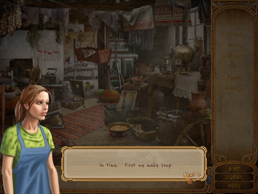 The story is dark. The background music is depressing (perfect for long winter nights...) and the whiny little boy, who has a diabolical moment at the end of the game, evokes instant antipathy. The hidden object screens are very normal, containing almost no out-of-place objects, which somehow makes objects harder to find, as does the fact that I sometimes need eagle eyes to spot them; I made frequent use of the self-recharging hint button. Somehow, the game seems unbalanced, with objects not equally distributed but sprinkled here and there. Once out of her clinically clean home and in the Russian village that her research leads her to, the likeably tough main character witnesses scenes of rural squalor and meets a cheerless young woman ("First, we make soup") who could have come straight out of a George Orwell novel. To make the game extra jarring, the unpleasant but moving end is followed by the mundane, and incorrect, announcement that this is a demo.