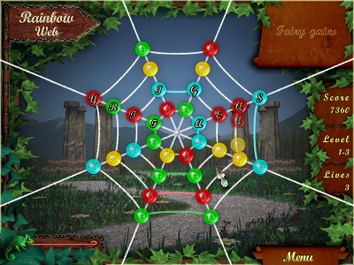 Rainbow Web was an Acer GameZone demo, with music only slightly less annoying than that of Age of Emerald. The Rainbow Kingdom is a place full of scenic beauty, hidden from the eyes of ordinary mortals. Jealous of its inhabitant's happy smiles, an evil wizard called Spider spins a web to cast it into shadows, but a kindly wizard opens a portal to this world so that you, yes YOU, may save the Magic Kingdom by knocking lettered beads off a spiderweb. The story, as told on a scroll you happen to find in the park, ends on: "So, go forth, brave savior." I shit you not.