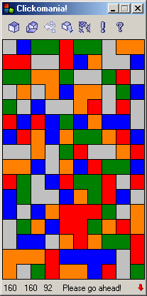 The idea is to make a chain of identical blocks adjacent to each other disappear by clicking on any block in the chain. The blocks don't have to be in straight lines, just as long as their sides are touching. As they disappear, the blocks above them fall down, sometimes forming new chains, or breaking up old ones. SameGame could be called a variation on Tetris, since the objective is to clear the game board, only the board is already filled instead of having blocks drop in it. There are variations in the implementation, though. Firstly, are points awarded for clicking away the longest possible chain, or is the main objective to completely clear the board? Clickomania bases the score only on how much blocks have been cleared; most game implementations do count chain length, MaciGame even basing its sound effect on it. Clicking on a minimum-length chain produces a "twirly-doop" sound, a longer chain goes "twirlytwirly-doop" and a really long chain snaking its way all over the board will disappear with a satisfying "twirlytwirlytwirlytwirlytwirlytwirlytwirlytwirly-doop!". It is possible that this sound effect alone was responsible for the extremely addictive nature of MaciGame.
