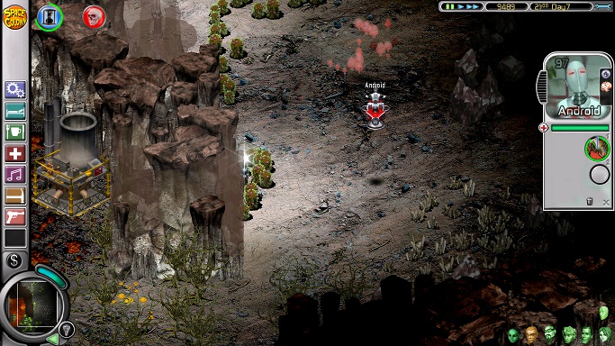 To androids which have between 100 and 50 seconds left, falls the job of eliminating pyrocyns. There is a good reason for not lighting up the northeast valley at the start of the game, apart from lack of money: it contains a patch of these explosive hot toadstools that any colonist on weeding duty, if they are visible, will try to "weed", generally resulting in the colonist's death. The dying android doesn't need a weeding post; it's enough to put down a light or two to make the area accessible, select the android and click on the pyrocyns. The android will travel to the spot clicked on, probably by space bike, land on the pyrocyns and be destroyed, taking some pyrocyns with it. Given the size of the pyrocyn patch, it may take two or more androids to clear it, or just one android if the android is lucky and doesn't get hurt on the first landing. These nasty toadstools need to go, because this is where a second base will be built, so that the first can be replaced by warehouses. Depending how soon the androids were built, this job can start around Day 6 and be finished two or three days later.