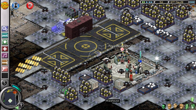 These two iron miners should be scraping away until Day 16, when all iron on their side of the silicon seam is gone, and they try to cross it to get at the ore on the other side. Send their operatives elsewhere as soon as their own iron content has been processed and popped out for the warehouse droids to collect, and delete them when they're empty (or sooner if the droids won't pick up the iron). Also delete the two oxygen plants and put new ones in some free spot, and any protruding bits of corridor. Now fill up the area below and around the bridge with warehouses. (At this point, there may be some pesky spots of vegetation remaining where the bottom left warehouse should be, so use the harvest marker - the green crosshair - to make Venus chop that up and then set it back to the area where she was harvesting before.)