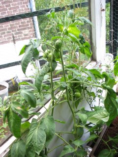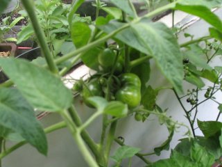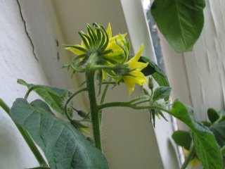 Two clusters of tomatoes are developing. By the looks of it, both contain