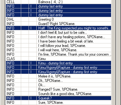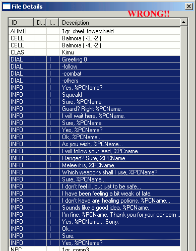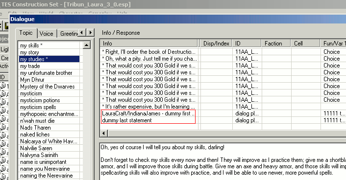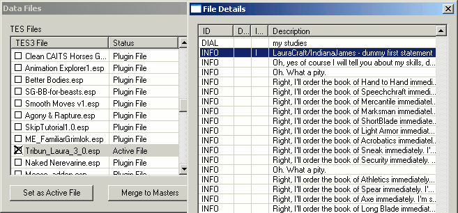 The import will mark all the dummy dialogue lines as changed, so the last step is to clean up the dummy lines in the Details screen. This is best done by sorting the lines by "Description", which arranges the dialogue lines in alphabetical order. If the mod alters greetings, these also need to be cleaned. Ditto for any changes to standard subjects, other special topics under Voice and Services, and any additions to standard journals. A complicated mod like Laura Craft needs a lot of cleaning. (Of course, now that the import files contain only the necessary subjects, the only thing to clean is the insertion points of the shared subjects in CompanionSubjects.esm.)