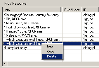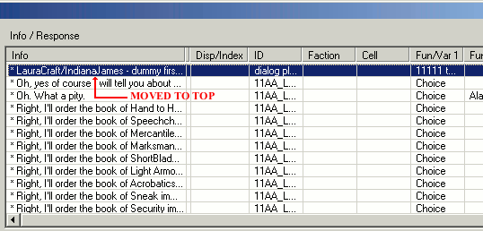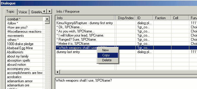 This can be done manually, but that doesn't really work as it's complicated and may cause dialogue lines to double. There is an easier method, which I applied to the "Kimu" and "Indiana James" ESPs as they were the smaller files in the conflicting pairs, so editing them would be less of a hassle. The way to change the ID of a line under a topic is to stand on it, right-click, and choose "Copy". This produces an identical line on top of the old line, but with a different ID. This new line is automatically selected. Select the old line again, and delete it. Now the old ID is gone. Repeat for all lines under the topic. Since duplicating the second highest line changes the topmost "dummy line" again, I cleaned the dummy lines from the mod when done.