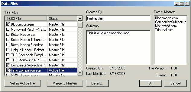 The dialogue files are meant to be used as follows. First, get the mod. (The Laura/James dialogue files are only for the Tribunal versions. Sorry, but it was a lot of work and I would only do the earlier versions if the author or someone else asked me to; originally, all I wanted was to make these two mods compatible on my own computer.) Then, start TESCS, select the mod, "CompanionSubjects.esm" and possibly "GMST Vaccine.esp" if needed, and if you have it. Go to the mod, set it to Active, and go to the Details screen. Select all lines of type DIAL or INFO, and press Delete to ignore them. (It is possible to sort the lines by type, so the DIAL and INFO lines can be selected in two big blocks after which Delete changes them all.) Now reload the mod, and save it. The old dialogue is gone, and the mod has added "CompanionSubjects.esm" to the dependency list.