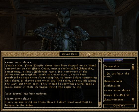 | Errands for Orvas | Errands for Orvas: Run some errands for Orvas Dren, a kind, caring individual, and become an honourary member of the Camonna Tong. Works with Morrowind only. See included text files for details. (Updated 01-02-2010: changed a ring so that both rings can be bought in Caldera.) (Updated again 13-01-2011 to make it compatible with a complementary plugin, made some small corrections, Ahnassi now also works with female characters (how else can you use your Camonna Tong influence to protect her?) and Banor Seran will give you Cyrodiilic brandy without protest.) (Updated AGAIN 26-08-2014 to fix small script errors. And on 12-10-2014 to move the affected script to the ESM.) |