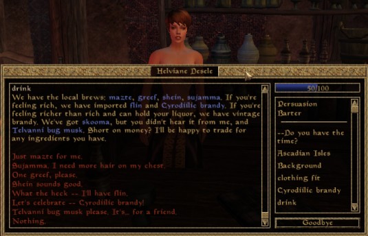 | Drinks at Desele's | Isn't it annoying that Helviane Desele runs a pub, yet she can't sell drink because she's the wrong class? With this added dialogue, she can, and so can Khinjarsi. Includes CompanionSubjects.esm. Only Morrowind required. (Updated 23-01-2010: GMSTs removed from CompanionSubjects.esm, and again on 23-02-2010 to correct a tiny error. And AGAIN on 12-10-2014: re-saved not because of changes, but to stop the warning messages about one file being older than the other.) |