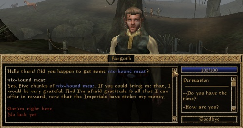 | Poor Fargoth | Did you betray Fargoth by turning his hidden treasure over to Hrisskar? This plugin will let you make amends. Morrowind version, and Tribunal version to take advantage of the Tribunal startscript feature. (Updated 01-09-2009: Y coordinate corrected. Again updated 12-10-2014 to fix a dialogue niggle concerning his ring.) Note: this plugin may not cooperate well with mods that influence the PC character generation, like SkipTutorial and ComprehensiveChargen. Make sure to get your duties assigned by the captain at Seyda Neen before talking to Fargoth. |