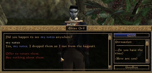 | Odds And Ends | Morrowind-only: fixed small stuff, changed some Telvanni and Morag Tong quests. See readme for details. Made to work with ErrandsForOrvas. (Updated 26-08-2014 to fix small script errors and add kiss sound for Nels Llendo. And on 12-10-2014 to move the affected scripts to the ESM.) |