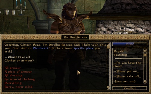 | Take off/Put on | A plugin for Tribunal and upwards to make smiths, merchants etc. take off anything you don't want them to wear (like that helmet you just sold them) and put on anything you regret telling them to take off. (Updated 13-01-2011: now using GetArmortype to remove only what armour is actually worn.) |