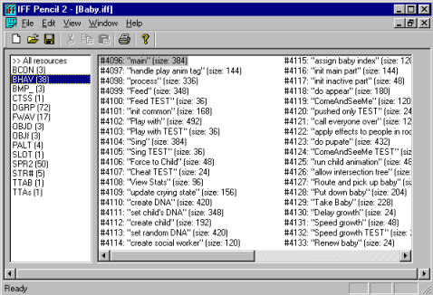 In the editing window of IFF Pencil, when I double-click on the BHAV block, the IFF file content shown in the right window is restricted to that belonging to the BHAV block: the code "trees". These are little programs that may be called directly or indirectly after choosing an action from the menu, or that may test whether a menu option should become visible at all, or that may direct events outside the user's control. One program can call another inside the same object, or it can call a common routine in one of the globals, or a "named tree" in another object; the bills call a "Pay bills" program in the mailbox to be paid, for instance. If there was a program "who stole the cookies" as in the example above, if many IFFs use it, it would be in a globals file, and the globals file name would be declared in the GLOB block, and the call to that program would be something like "(semi) who stole the cookies" (where "semi" means semi-global; "glob" is used for the truly global ones from "Global.iff"). If it's only used in this object, it would be another tree in the BHAV block, and the call would go "(priv) who stole the cookies". Whether global or private, the call will always come with an answer True/False/Error, and maybe a new value in the "Temporary storage", what I assume to be a public variable. The private variables available to a tree (private meaning, they can't be read by other trees) are called "Local variable" and like their public counterparts, are numbered from 0 upwards. They're just a row of empty pigeonholes to store data in as needed. Two trees found in almost every object are "init", to put an object into the virtual world, and "main", to keep it there.
