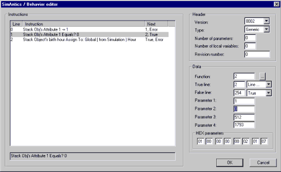 The editing window has a header rectangle and a data rectangle. The data rectangle only applies to the line of code being edited, the header rectangle to the whole BHAV tree. The header does have a function, I learned on a hacking forum: this is where the number of variables and parameters used in the whole tree is declared. If these are not filled, said variables and parameters are ignored, and the object doesn't work. The average hacker, only torqueing existing code, can modify hundreds of objects and never run into this; it only becomes apparent when adding entirely new code.