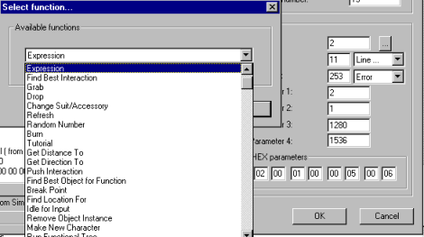 The data rectangle is where it all happens. This contains the outcome line numbers, the function, or type of code line (by default 2, Expression; but it can be many things, as the dropdown shows) and the four parameters that determine what the line does, in decimal and hex (double byte) format. Changing the value of the parameters will change the code line: in the "simple tree" example two paragraphs up (though it may be hard to see), if I change the highlighted value of the second parameter, 0, to 1, the expression will become: "is the stack object's attribute 2 equal to 1?" This suggests that parameters 1 and 2 are at both ends of the equation, which is often the case. Parameter 3 is the "sign" in the equation, in this case "is equal to?" and parameter 4 has some say over what's being compared. That's how it works in Expressions (function type 2). In other functions, the parameters have a different purpose or may even be ignored.